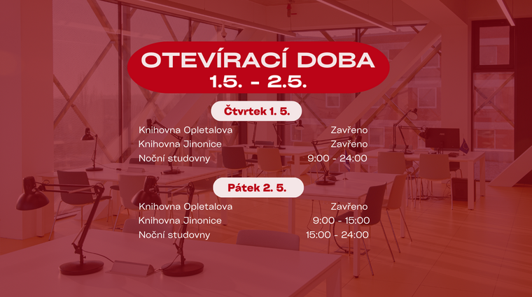 V pátek 2. 5., v rámci děkanského dne, bude pobočka Opletalova uzavřena, pobočka Jinonice bude otevřena od 9:00 do 15:00 a noční studovna od 15:00 do 24:00.