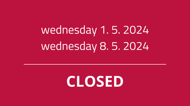 Because of the public holiday, all library branches will be closed on Wednesday 1. 5. and 8. 5. 2024. Night Study Room will be closed as well.